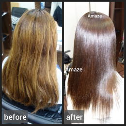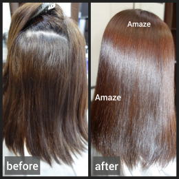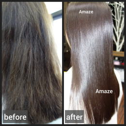 半年前くらいに他店で縮毛矯正をされた新規のお客様です。 縮毛矯正はチリチリになるものだと思っていたみたいです。 中間から毛先はダメージがかなり強いですが、ほんの少し弾力があったのでここは勝負。 毛先は傷んで広がっているところをAmazeオリジナル保湿ケアでしっかりケアしました。 毎日洗って乾かすだけでツルツルになります♪ |